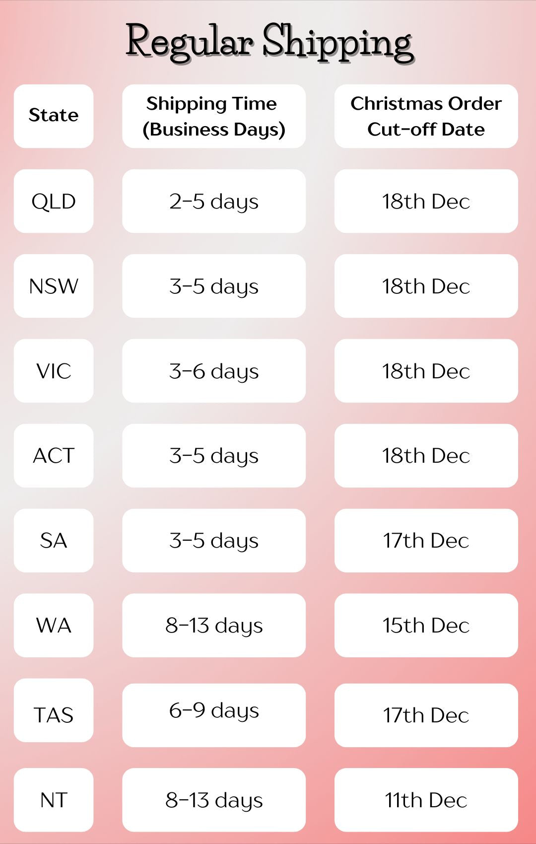 Order before these dates using Standard shipping to receive by Christmas day!