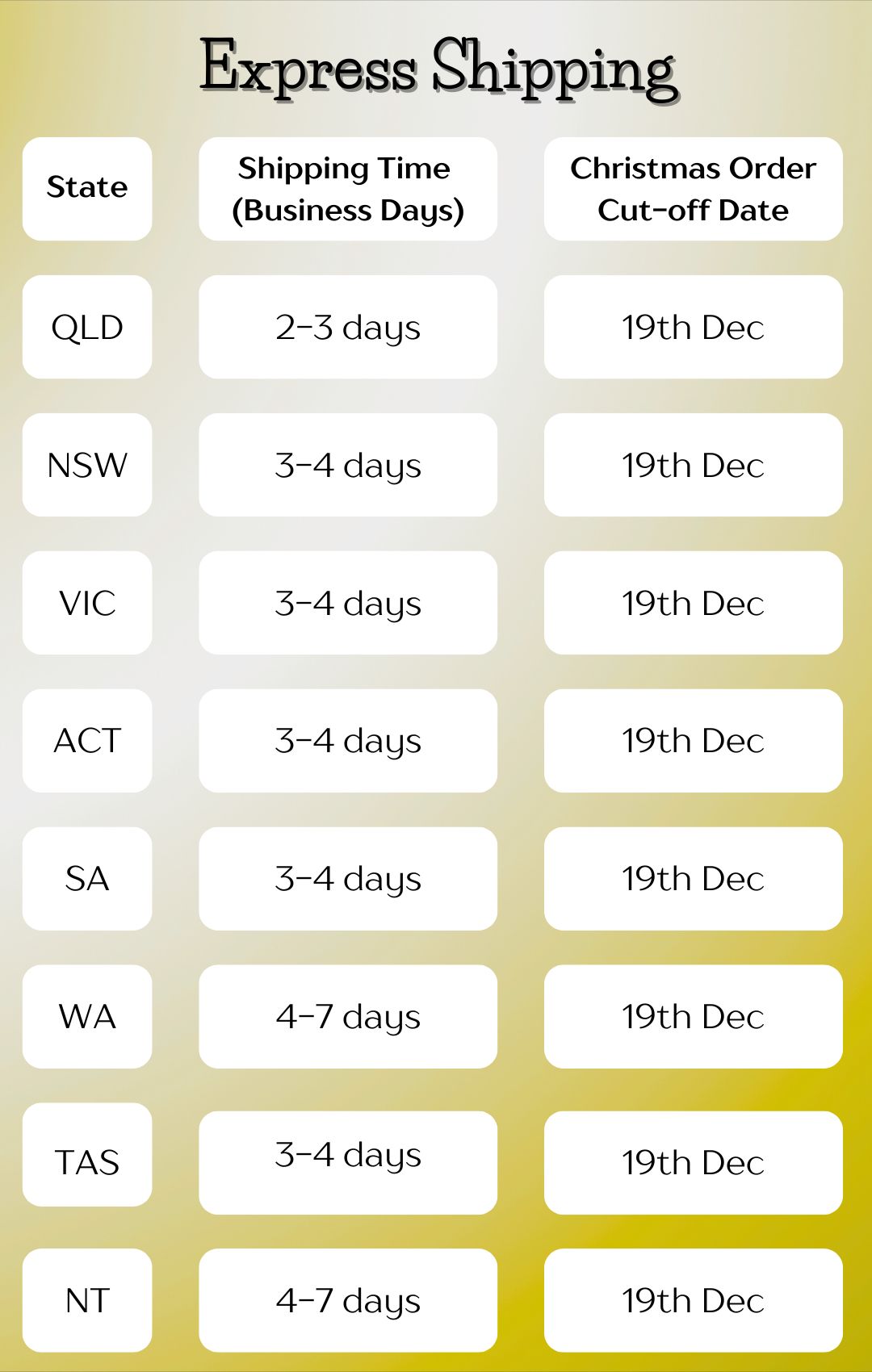 Order before these dates using Express shipping to receive by Christmas day!